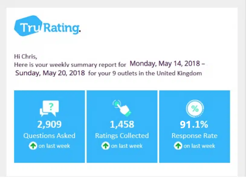 How good was the service you offered to your customers last week? Did it improve or get worse? Which outlet performed best? What about your TruPromoter score? With TruRating’s Weekly Summary Reports you can find out the answers to these questions within seconds, every Monday morning via an email sent directly to your mailbox. Personalized […]