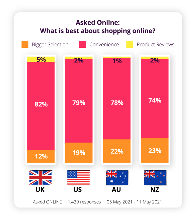 When it comes to the regions – we finally see an Australia/New Zealand alignment, with both nations preferring online’s Bigger Selection while the UK leads on convenience, perhaps due to shorter shipping times.