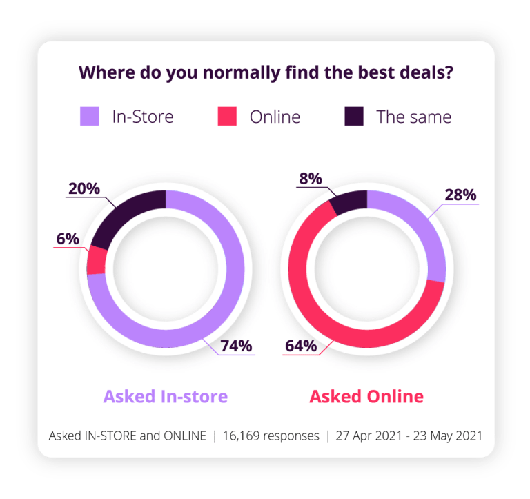 By and large, customers believe the best deals can be found where they’re already shopping. Perhaps not shocking. Yet does this split suggest retail polarization in action? In-store shoppers are most fanatical about where they like to shop. The question begs – from a retailer perspective, does it matter? If you can cater to both needs, perhaps that’s enough.