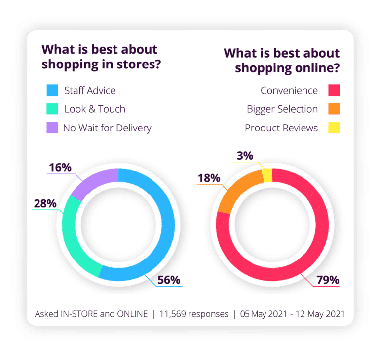 Overwhelmingly, when it comes to shopping in-store, it seems to be all about the people. For retailers questioning the importance of investing in staff – the results speak for themselves. The tangible feel of products is also important, with a final bonus of instant gratification.