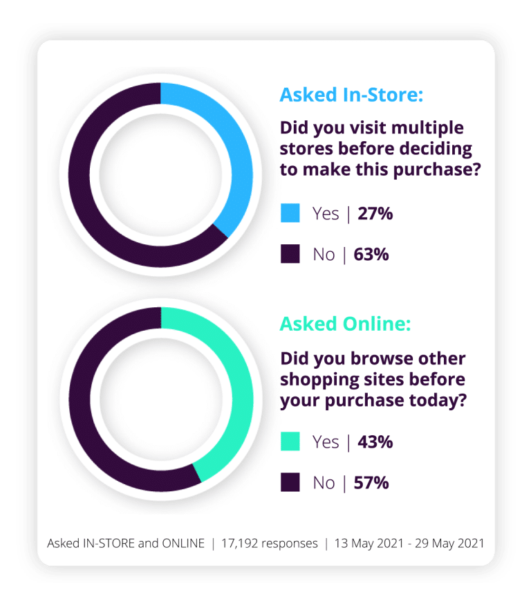 In the age of infinite choice, it might seem surprising that most in-store and online shoppers are less likelyto play the retail field before making a purchase. While online browsing is certainly easier, the types of purchase undoubtedly play a role, with big-ticket items more likely to draw a wider search before a decision is made.